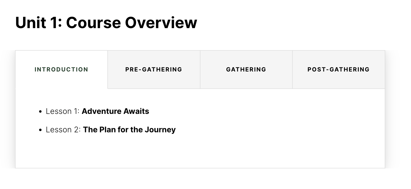 In the picture, this is an example of the menu from Unit 1. Here you can see the sections and each lesson within the section. As a reminder, the introduction and pre-gathering sections are to be done by individuals before the gathering. The gathering sections are all done together. Lastly, the post-gathering section is to be done after the group gathering.